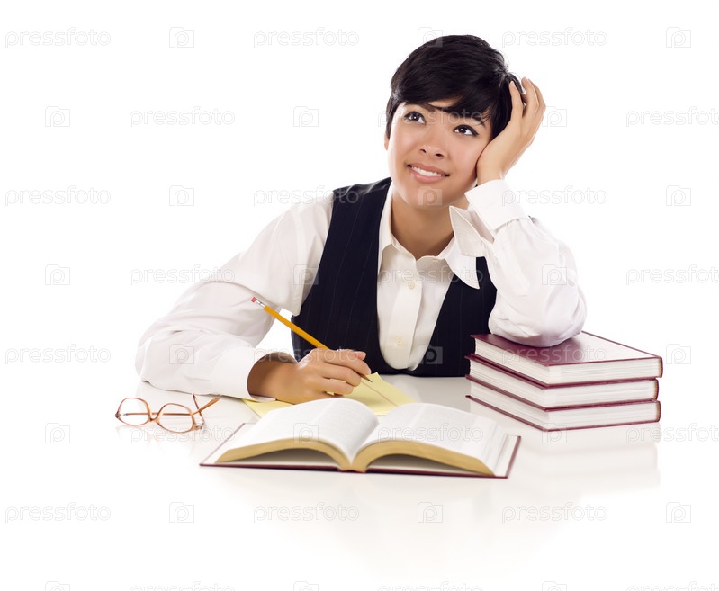 Улыбающаяся студентка смешанного происхождения с книгами на белом фоне