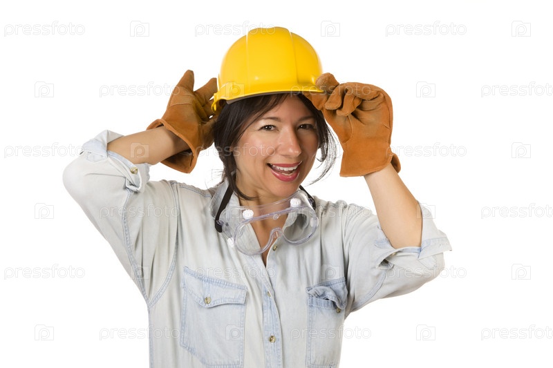 Привлекательная женщина-латиноамериканка со шлемом, защитными очками и перчатками