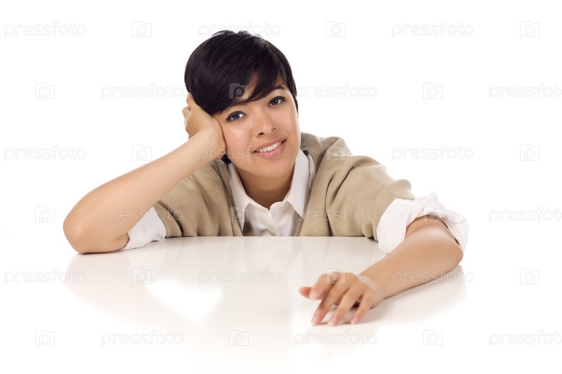Улыбающаяся девушка смешанного происхождения сидит на белом фоне