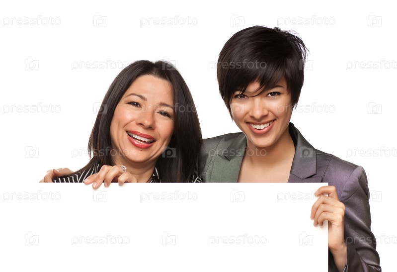 Привлекательная мать и дочь с пустым баннером на белом фоне