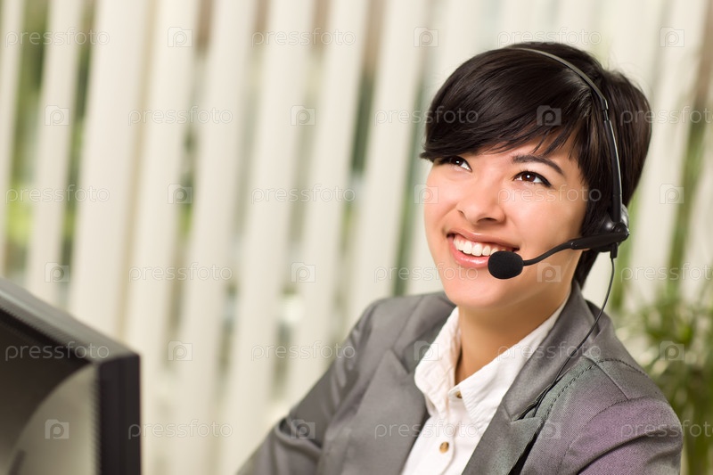 Привлекательная улыбающаяся молодая женщина с гарнитурой