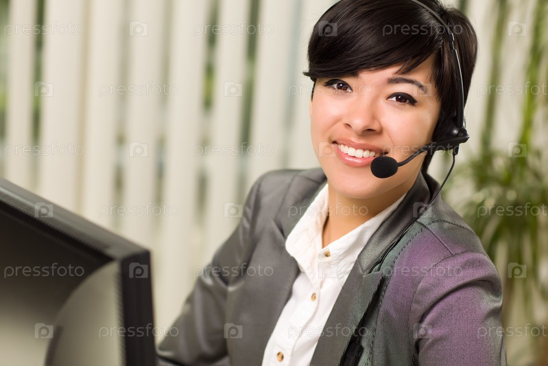 Привлекательная улыбающаяся молодая женщина с гарнитурой
