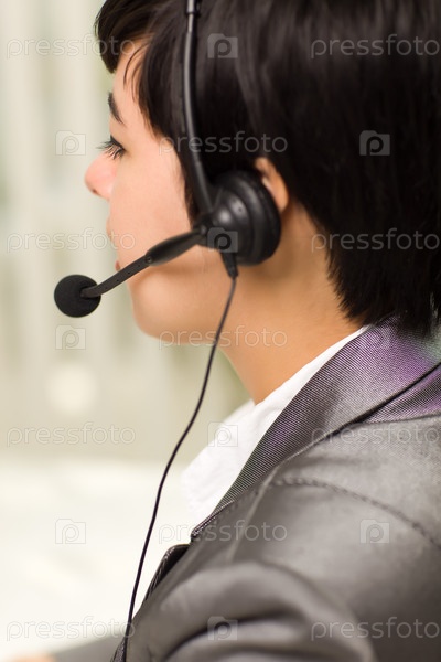 Привлекательная улыбающаяся молодая женщина с гарнитурой