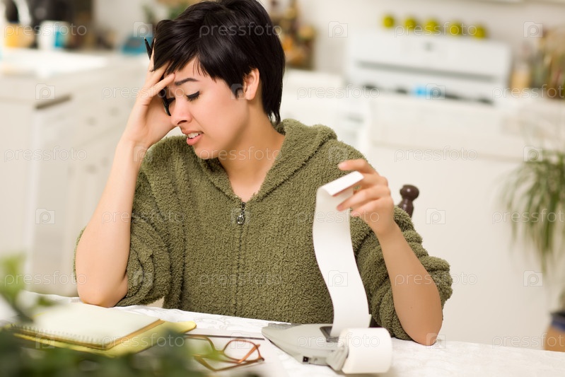 Молодая женщина смешанного происхождения мучается над финансовым отчетом