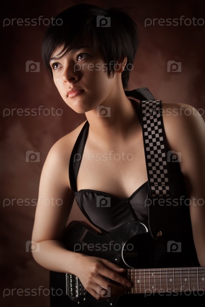 Привлекательная девушка смешанного происхождения играет на гитаре
