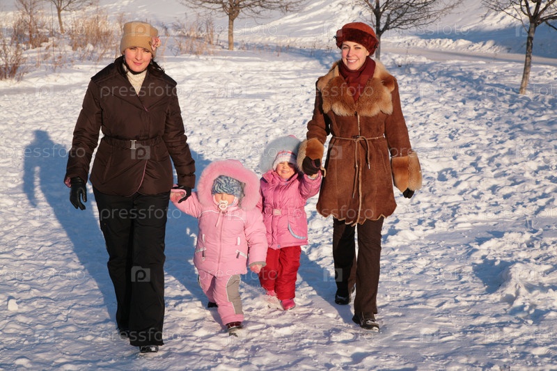 Двое матерей с детьми на прогулке зимой