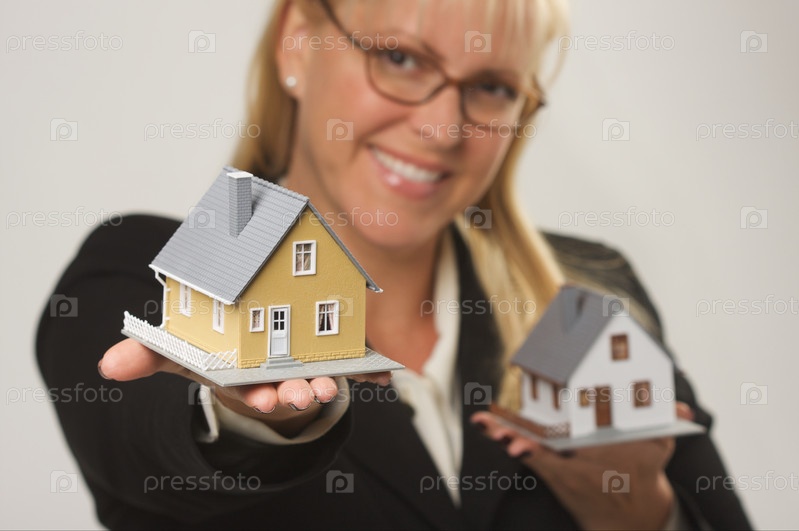 Радостная женщина держит два макета дома