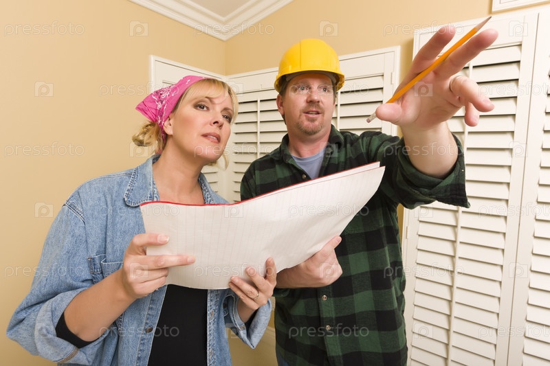 Подрядчик в каске обсуждает планы с женщиной