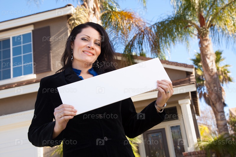 Привлекательная латиноамериканская женщина держит пустую табличку, стоя перед домом