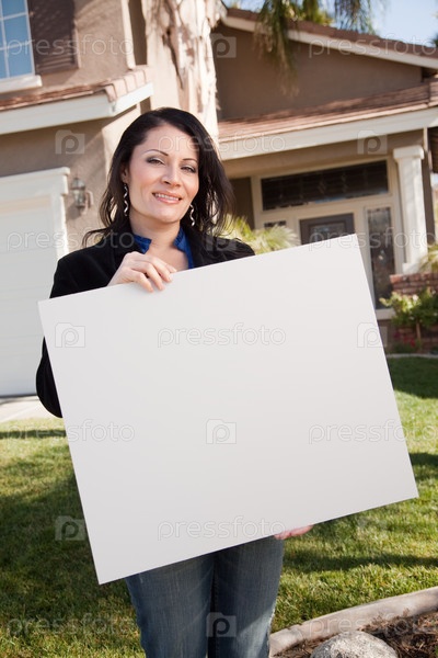 Агент по продаже недвижимости с пустым баннером на фоне дома