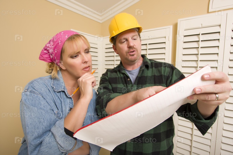 Подрядчик в каске обсуждает планы с женщиной