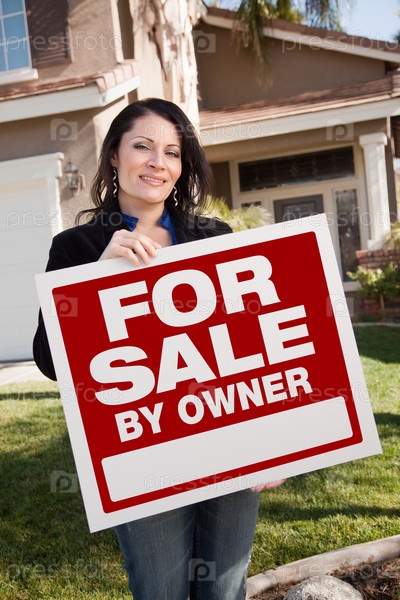 Привлекательная латиноамериканская женщина держит знак ПРОДАЕТСЯ ВЛАДЕЛЬЦЕМ перед домом