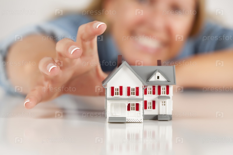 Улыбающаяся женщина позади модели дома на белой поверхности