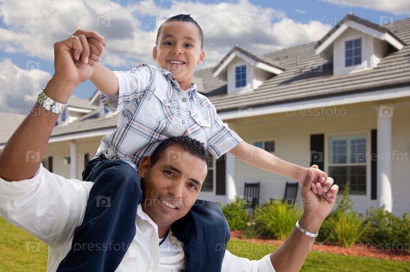 Латиноамериканский мужчина с сыном перед домом
