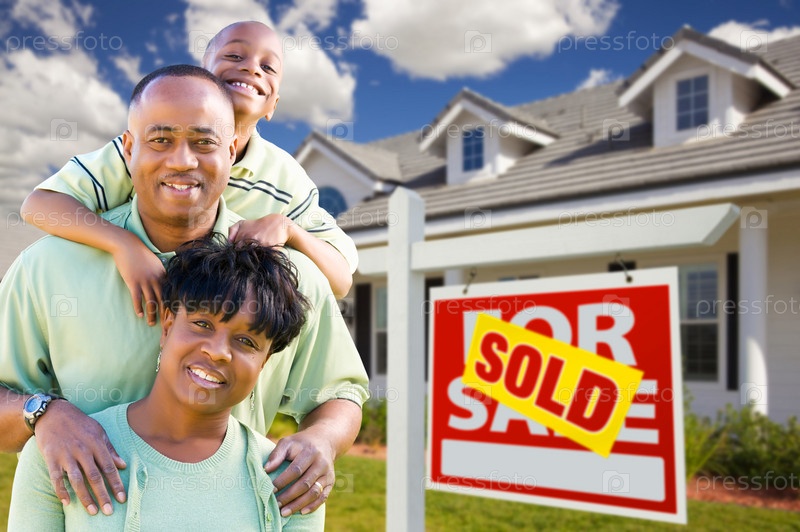 Привлекательная афро-американская семья на фоне дома и символа продажи