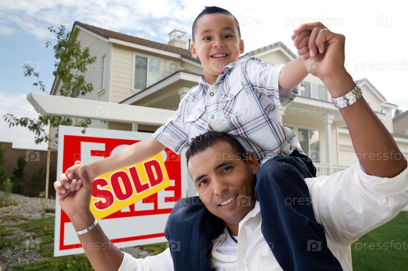 Латиноамериканский отец с сыном перед их новым домом