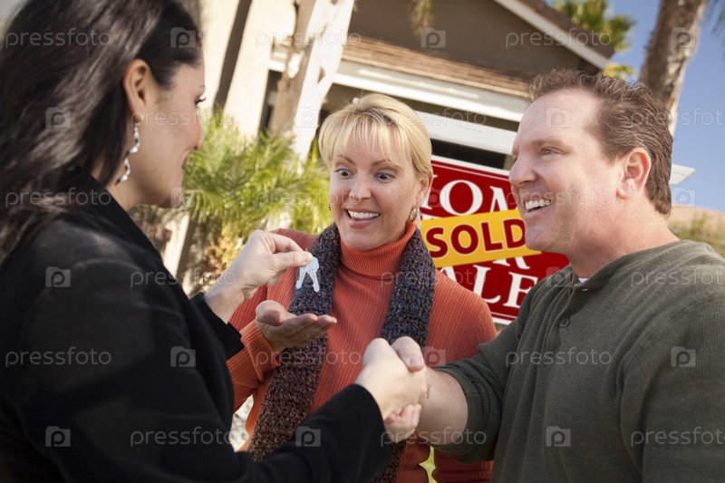 Агент по недвижимости передает ключи радостной паре