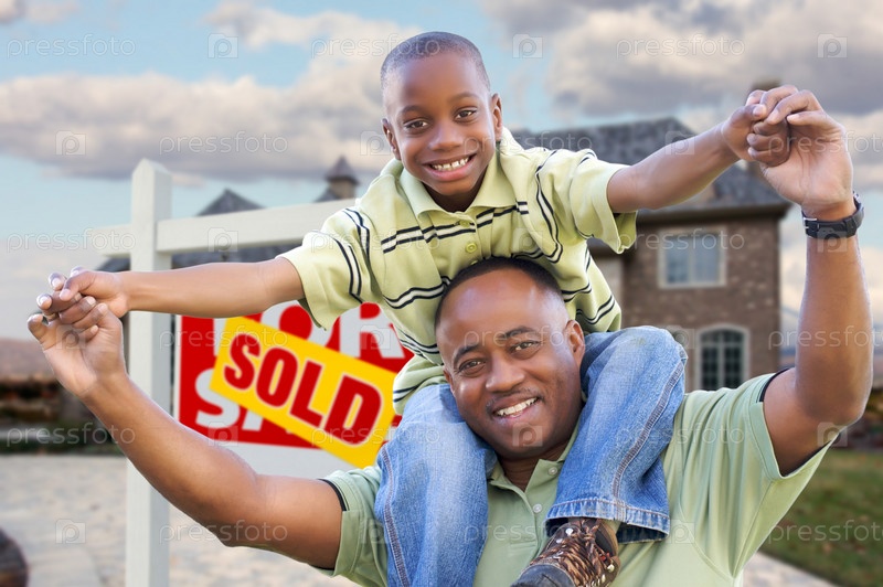 Отец и сын перед домом со знаком о продаже