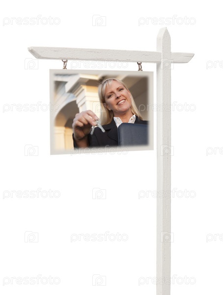 Агент передает ключи от дома на знаке продажи недвижимости