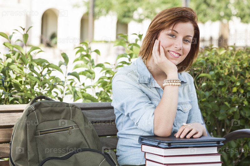 Молодая студентка с рюкзаком на скамейке в кампусе