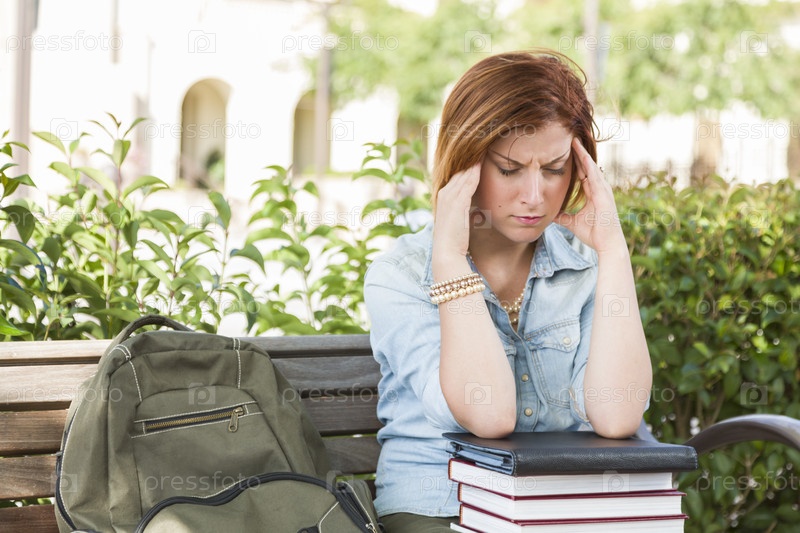 Молодая студентка с головной болью на скамейке в кампусе