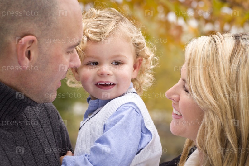 Молодые привлекательные родители с ребенком в парке