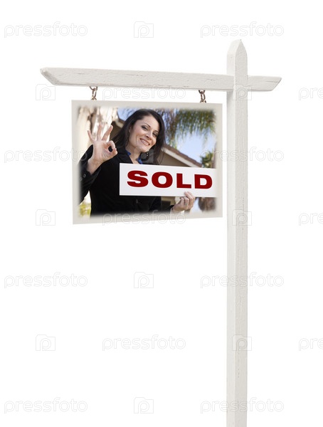 Агент и дом на знаке продажи недвижимости