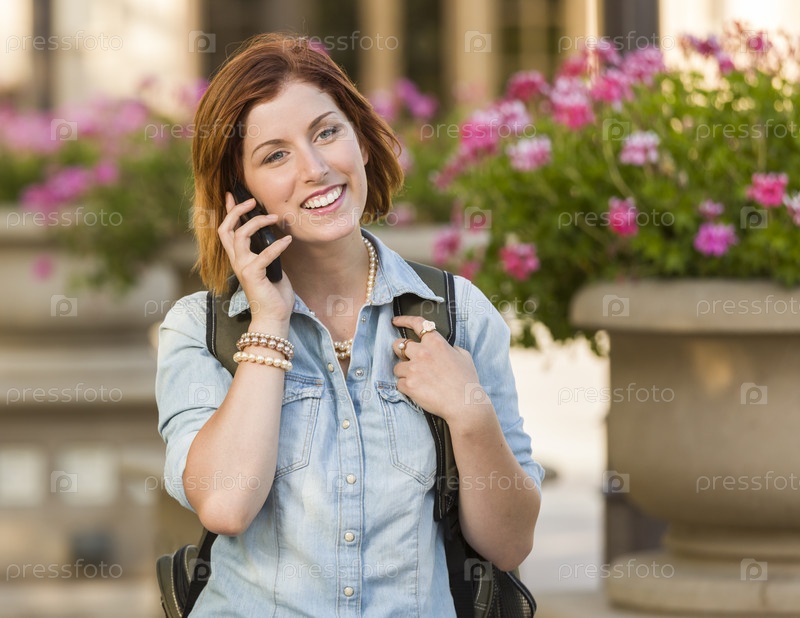Улыбающаяся студентка говорит по телефону на улице