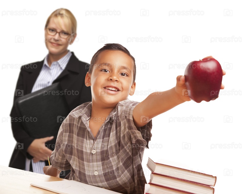 Латиноамериканский школьник с яблоком и взрослая женщина на заднем плане