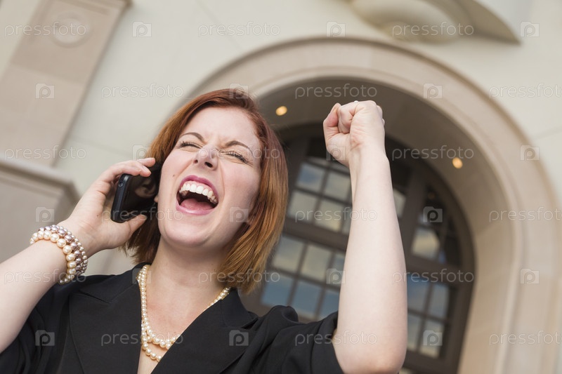 Радостная бизнес-леди с кулаком и мобильным телефоном