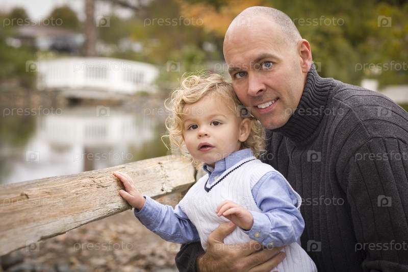 Красивый отец и сын в парке