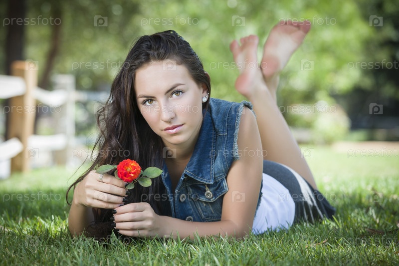 Привлекательная девушка лежит на траве в парке