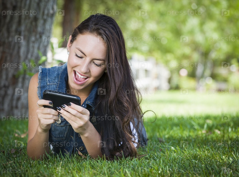 Привлекательная девушка смешанного происхождения пишет сообщение на мобильном телефоне