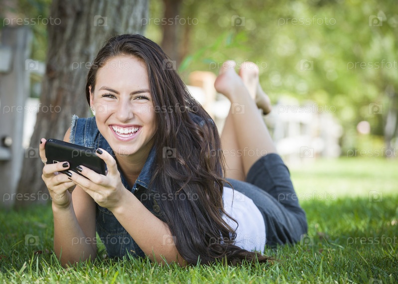 Привлекательная девушка смешанного происхождения пишет сообщение на мобильном телефоне