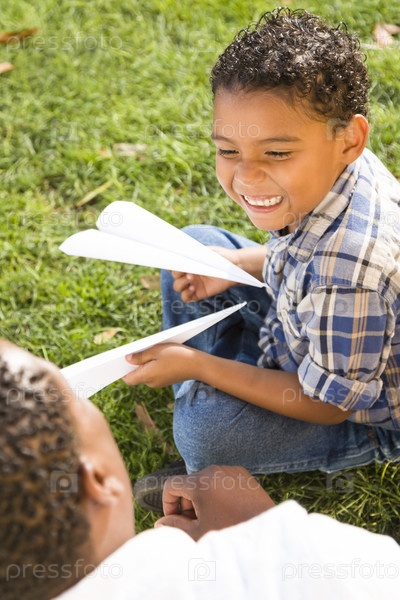 Отец и сын афроамериканского происхождения играют с бумажными самолетиками