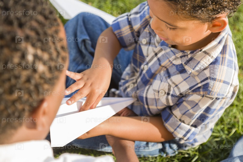 Отец и сын афроамериканского происхождения играют с бумажными самолетиками