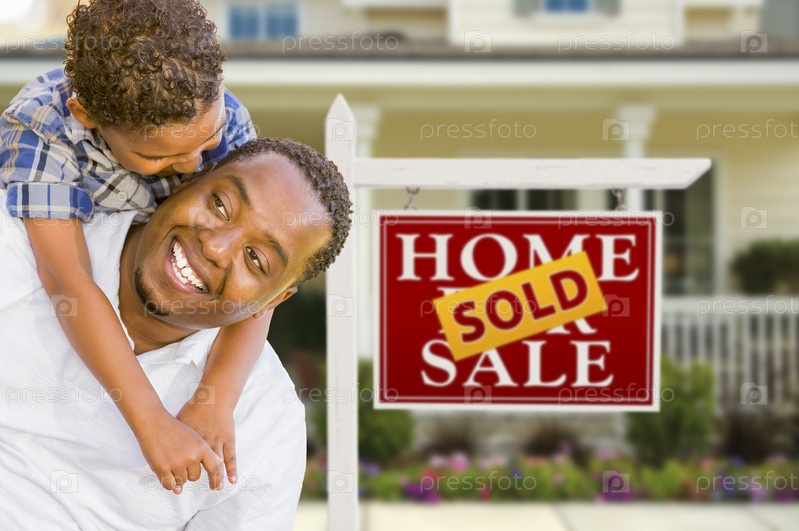 Отец и сын перед домом со знаком о продаже