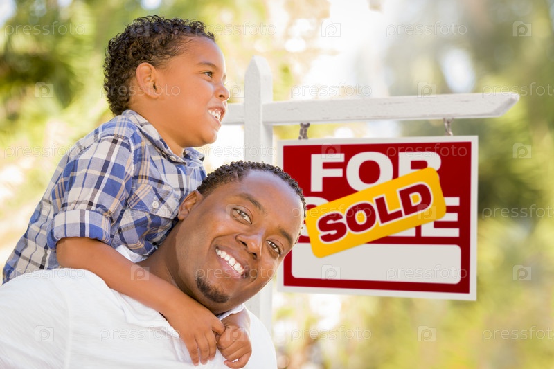 Отец и сын смешанного происхождения на фоне знака продажи недвижимости