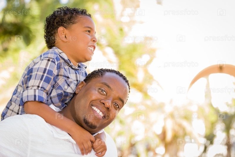 Отец и сын смешанного происхождения отдыхают в парке