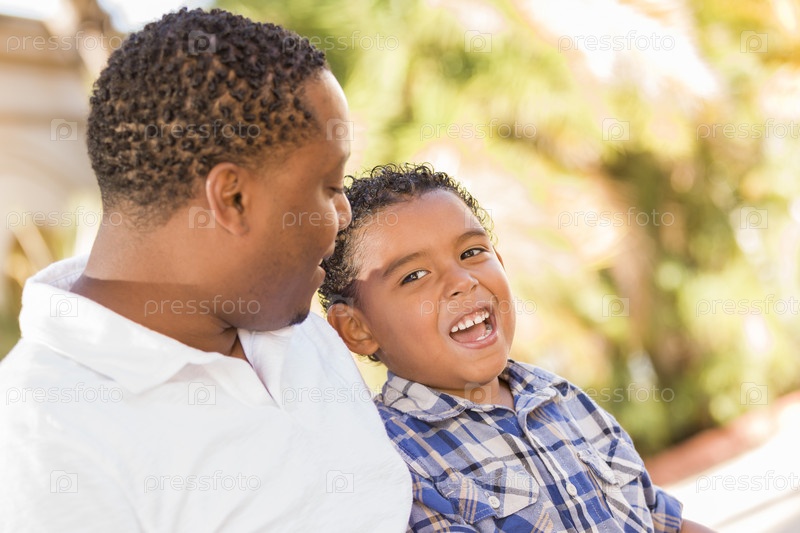 Отец и сын смешанного происхождения отдыхают в парке