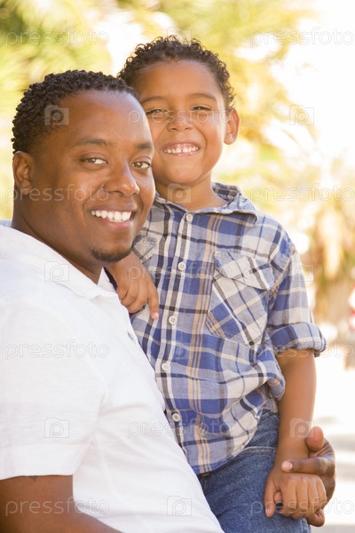 Отец и сын смешанного происхождения отдыхают в парке