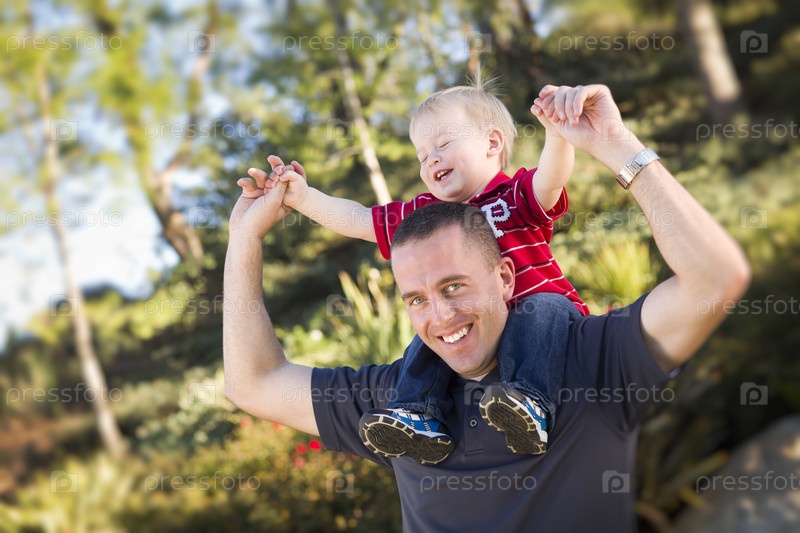 Молодой счастливый отец с ребенком на плечах