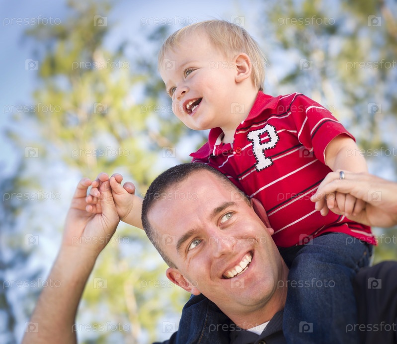 Молодой счастливый отец с ребенком на плечах