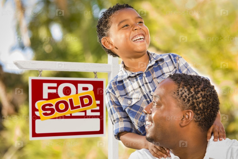 Отец и сын на фоне знака продажи недвижимости
