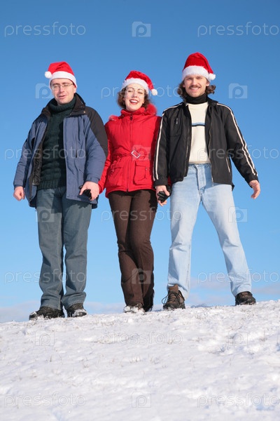 Трое друзей стоят на снегу в шапках Санта-Клауса