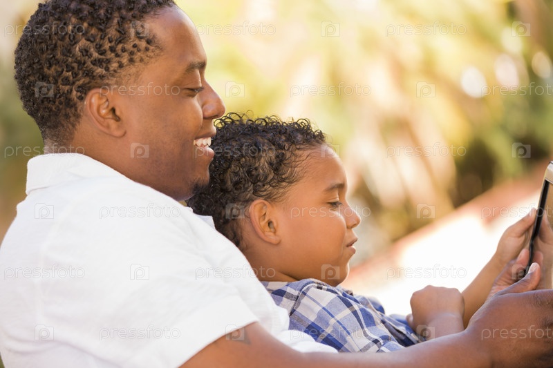 Отец и сын афроамериканского происхождения пользуются планшетным компьютером