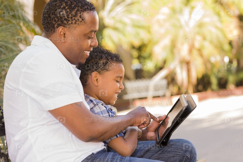 Отец и сын афроамериканского происхождения пользуются планшетным компьютером