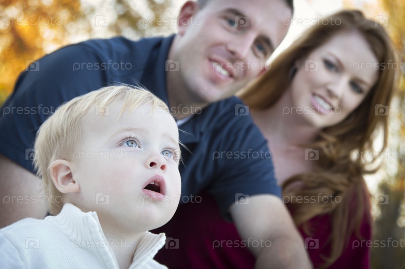 Милый ребенок смотрит на небо на фоне молодых родителей