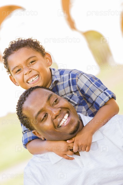 Сын сидит на плечах у отца в парке
