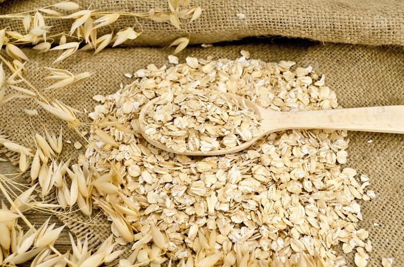 Овсяные хлопья в ложке на мешковине